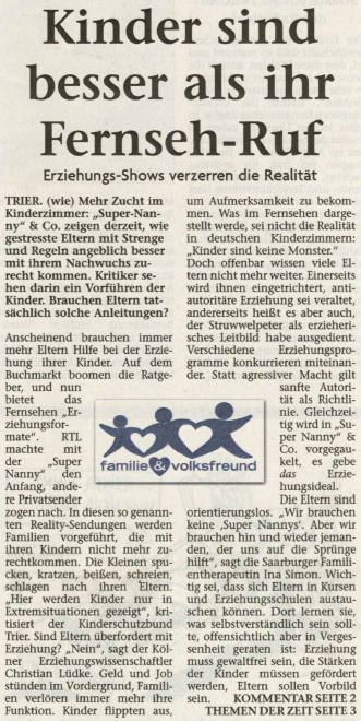 - Feb. 2005 – Regionalzeitung Trier „Trierischer Volksfreund“ – „Kinder sind besser, als ihr Fernseh-Ruf"“ – Artikel zu der Frage: Brauchen wir die Supernanny? Erziehungsshows verzerren häufig die Realität